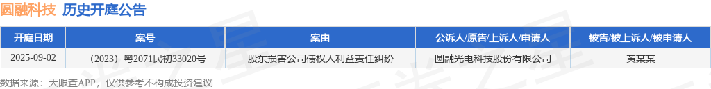 本站消息,根据天眼查APP显示,近日公布了一则圆融光电科技股份有限公司作为原告/上诉人的开庭公告,详细内容如下: